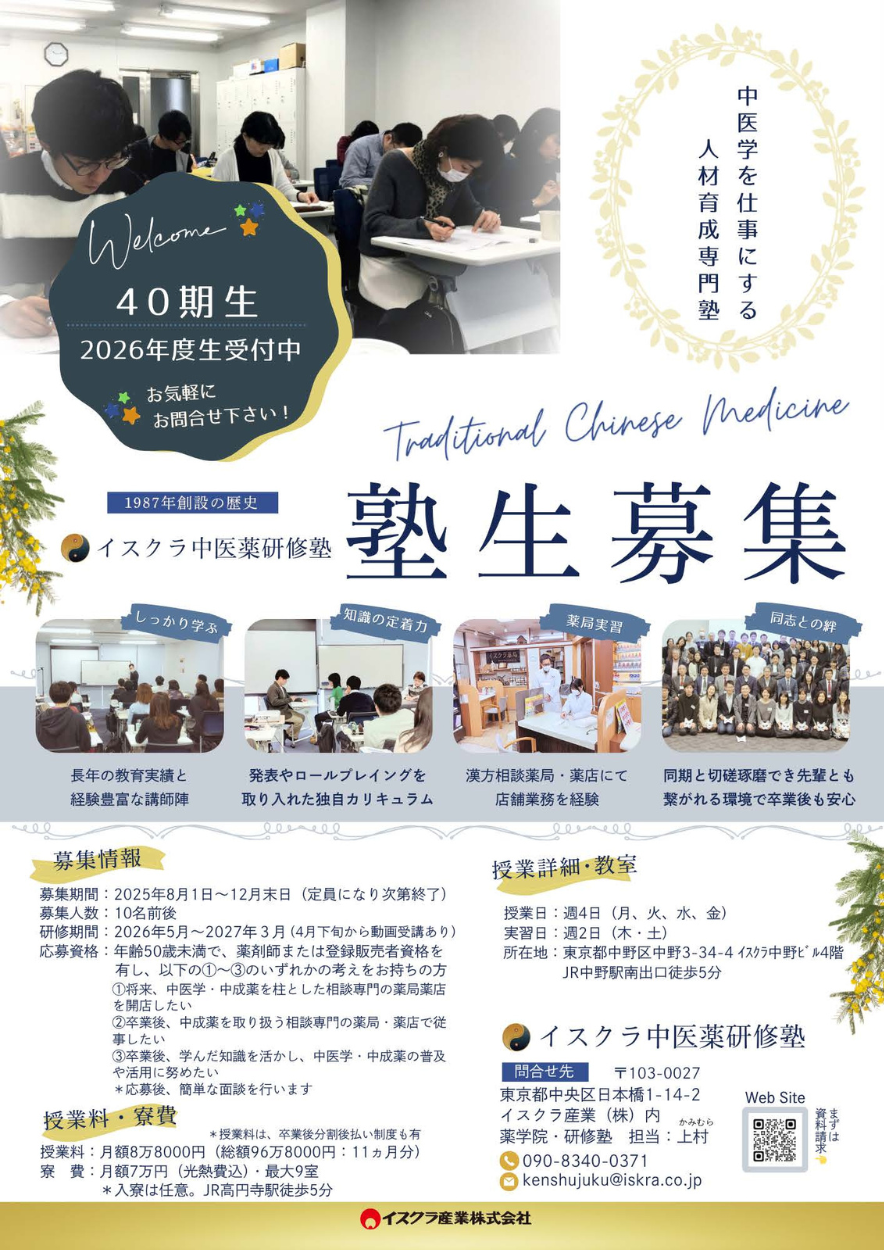 1987年創設以来、数多くの卒業生を輩出してきた イスクラ中医薬研修塾 で、40期生を募集しています!