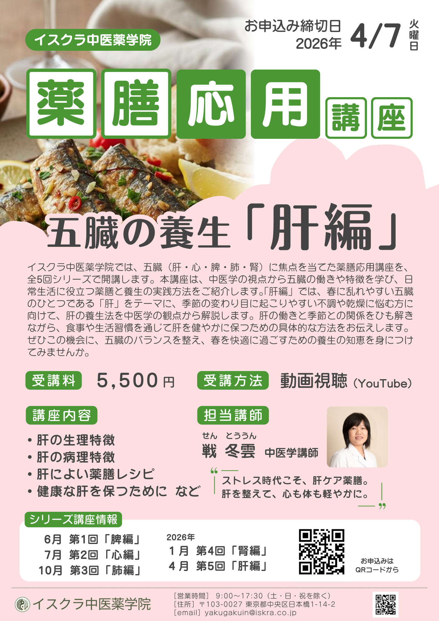 イスクラ中医薬学院が運営する薬膳応用講座「五臓の養生」の募集がスタートしました。薬膳応用講座の第5回は 五臓の養生「肝編」。シリーズ全5回の最終回となります。