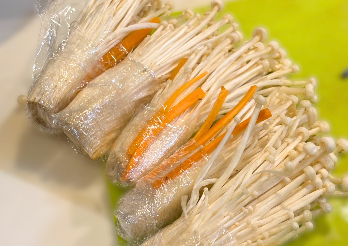 工程①で、えのきとにんじんは、画像のようにラップで巻いてください。