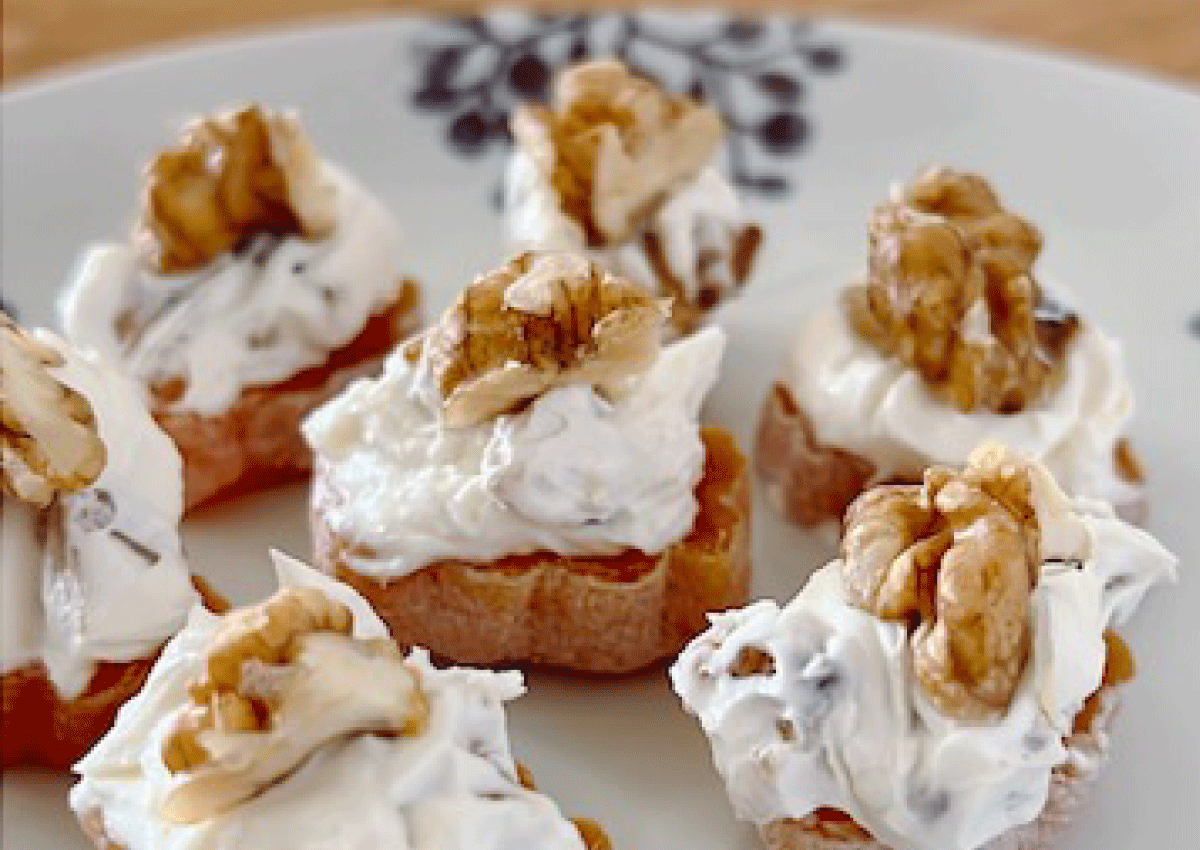 - 2クリームチーズを常温で柔らかくし、メープルシロップ、刻んだくるみを混ぜる。